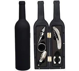 Surprinde orice pasionat de vin cu un set elegant și practic! Ambalat într-o carcasă discretă, în formă de sticlă, acest kit conține tot ce ai nevoie pentru a deschide, servi și păstra vinul în cele mai bune condiții. Perfect pentru acasă sau ca idee de cadou.